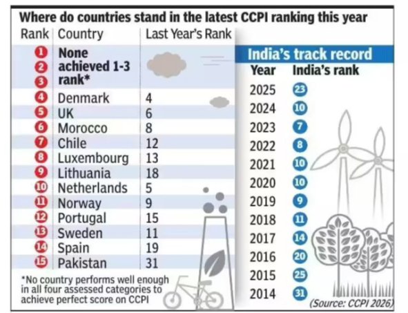 - India has dropped 13 places and now stands at 23rd position in the Climate Change Performance Index (CCPI) 2026.