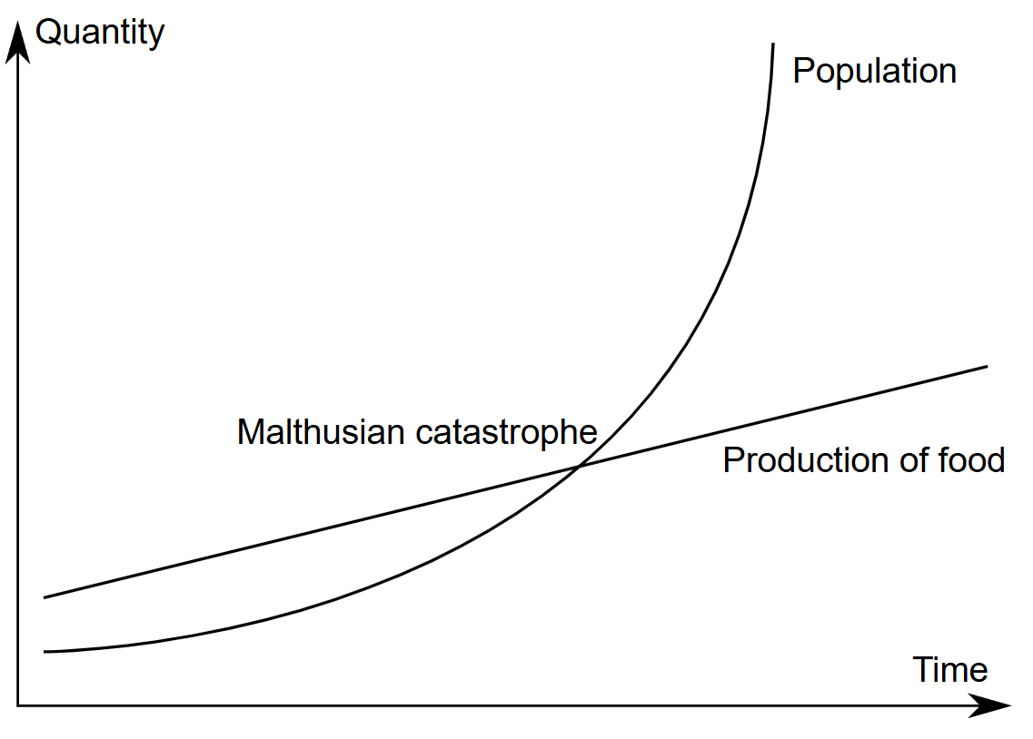 In 1798, the English economist Thomas Malthus presented his Essay on the principle of population. In it, he popularized the idea of the Malthusian trap (or Malthusian catastrophe), according to which he predicted that the population would continue to grow exponentially, doubling every 25 years, while resources would only grow arithmetically. This decoupling, according to Malthus’ theory, would cause continuous impoverishment of citizens, leading to the extinction of humanity by 1880.