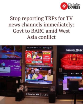 The government’s decision to temporarily stop TRP reporting for TV news channels aims to reduce sensationalism and panic during the ongoing West Asia conflict. Since TRP ratings strongly influence media competition and advertising revenue, suspending them may encourage more responsible and balanced news coverage during sensitive international events.