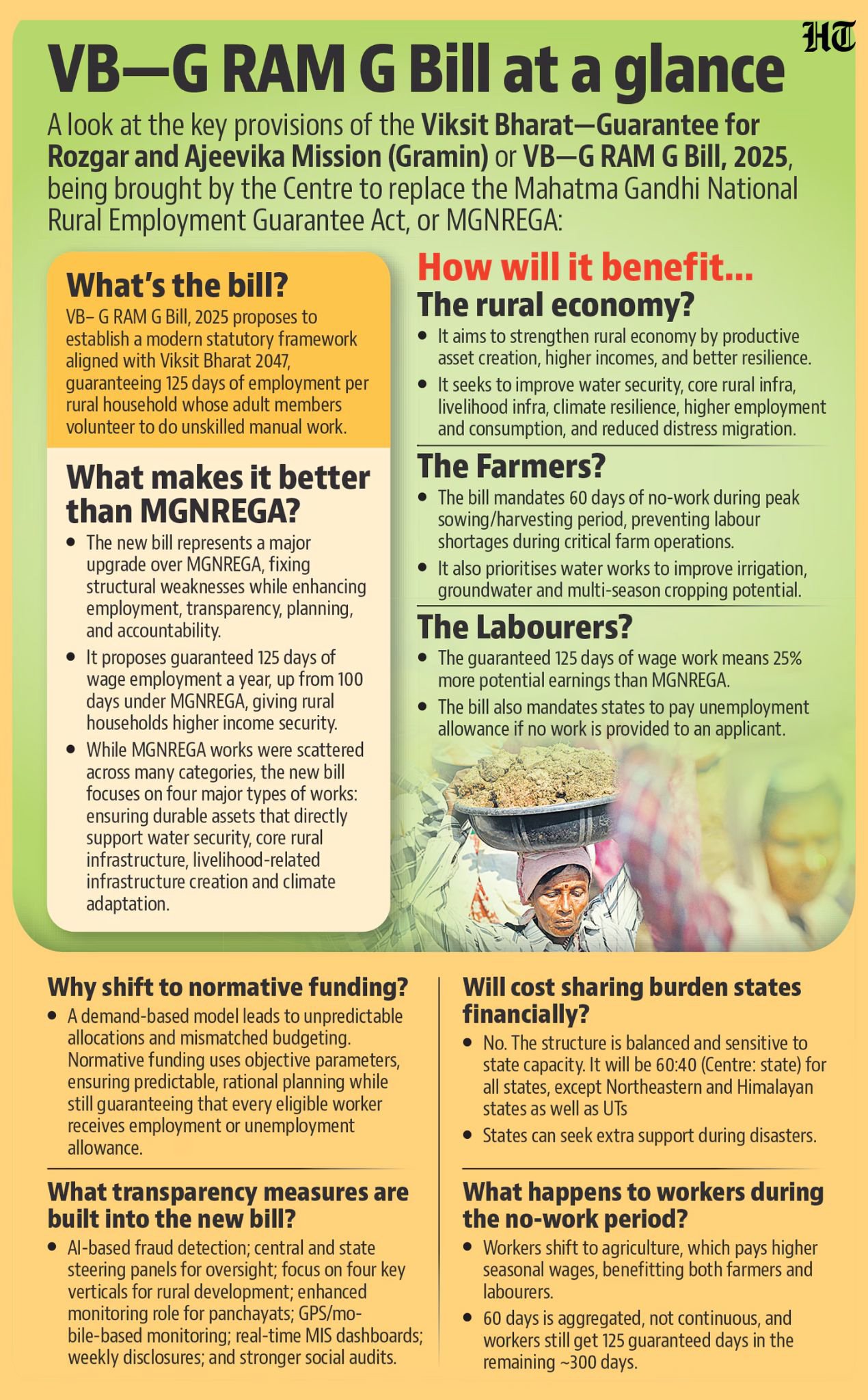 - The Union government introduced The Viksit Bharat—Guarantee for Rozgar and Ajeevika Mission (Gramin) Bill, 2025, also known as the VB-G RAM G Bill, in the Lok Sabha on December 16, 2025.