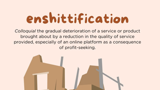 • Coined by Cory Doctorow (In 2022, the Canada-born author, tech journalist, and activist), the term identifies how platforms like Google and Amazon degrade over time by prioritizing shareholder value at the expense of the user experience.