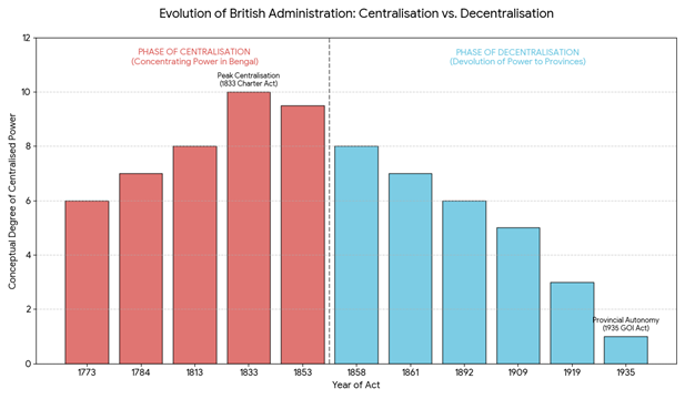 The bars represent the degree of power concentrated at the central level (Governor-General/Viceroy) versus the power devolved to the provinces: